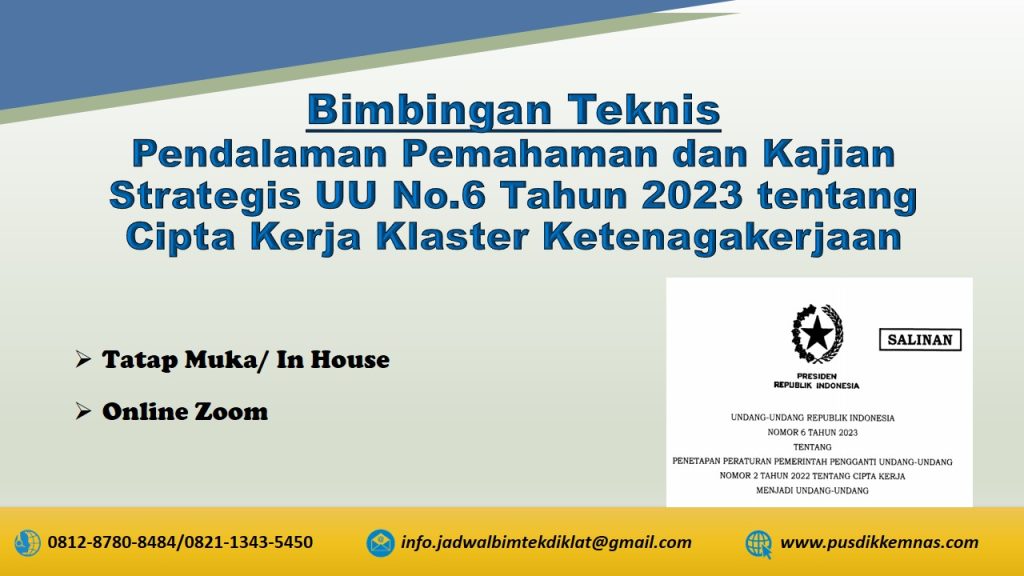 25 Jul PELATIHAN PERUSAHAAN-PT-CV, BIMTEK, BIMTEK TERBARU, INFO BIMTEK, INFO JADWAL BIMTEK/ DIKLAT, JADWAL BIMTEK 2023, JADWAL TRAINING 2023 Bimtek UU No.6 Tahun 2023 tentang Cipta Kerja Klaster Ketenagakerjaan Ditulis oleh PUSDIKKEMNAS 12/10/2024 Lanjutkan membaca